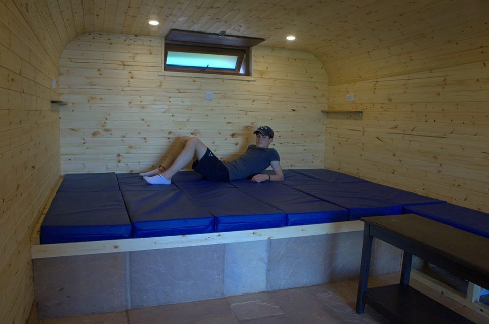 The generous size of our Hobbit Holes makes them ideal for family living. The interior is 15m square and can comfortably accommodate up to 2 adults and 4 children. Inside you’ll find a bench, table, heater, bin, lights, plugs and USB charge sockets. A large soft covered sleep ledge (3m x 2m) covers one end.
